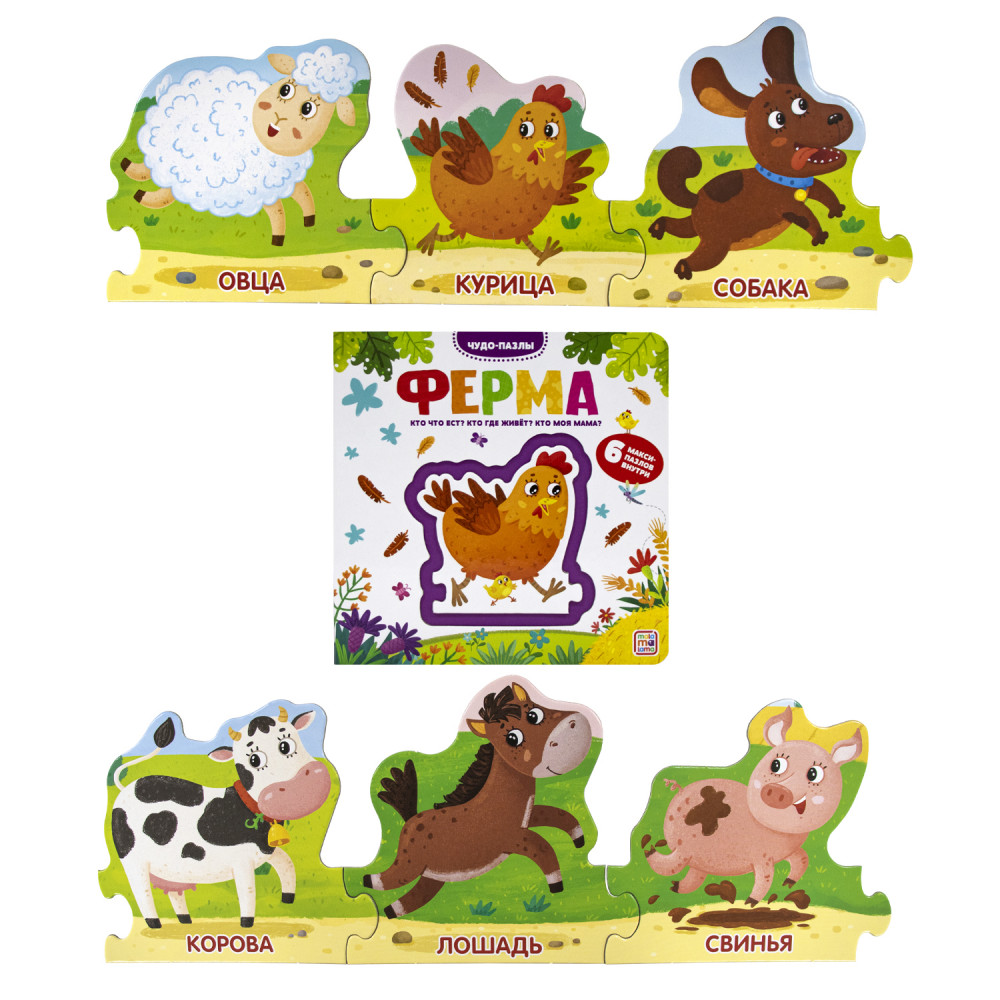 "Чудо-пазлы. Ферма" — это занимательная книжка с пазлами, на 12 страницах которой находятся весёлые стихи и 6 крупных пазлов. Ребёнок сможет легко извлечь такие пазлы, соединить их между собой и собрать "паровозик", перемещая фигурки по своему усмотрению.  Яркая и контрастная печать делает картинки максимально насыщенными. Страницы изготовлены из качественного и плотного картона. Размер книги — 160*160 мм.