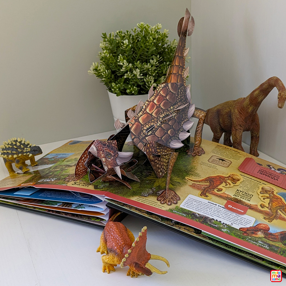 Интерактивная энциклопедия «Динозавры и другие доисторические животные» от торговой марки Malamalama — это захватывающее путешествие по доисторической Земле. Ваш малыш сможет прогуляться в древних тропических лесах, где познакомится со знаменитыми свирепыми ящерами. Масштабные POP-UP конструкции, множество клапанов и выдвигающихся элементов, интересные факты, натуралистичные иллюстрации — всё это ждёт юного читателя под обложкой энциклопедии. Интерактивная энциклопедия — идеальная настольная книга для маленького почемучки. Разгадывайте главную загадку нашей планеты — изучайте удивительных ящеров вместе с Malamalama!
