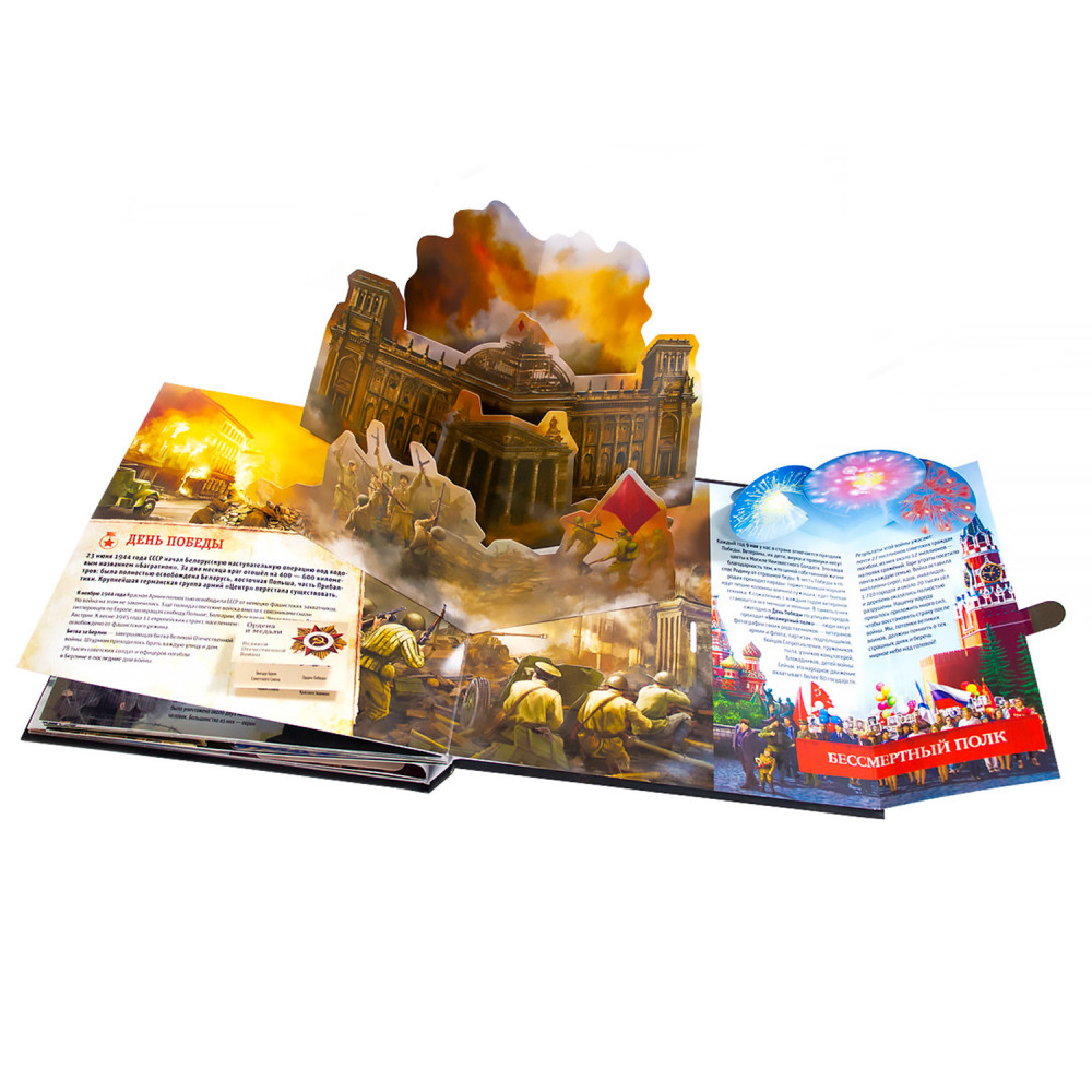 Уникальная интерактивная энциклопедия, посвященная великой отечественной войне. История оживет благодаря объемным pop-up конструкциям и реалистичным иллюстрациям техники и вооружения на каждом развороте. Открывай окошки, изучай карты сражений, читай дополнительные брошюры и карточки. Погрузись в мир исторических событий вместе с интерактивной энциклопедией "Великая Отечественная война"