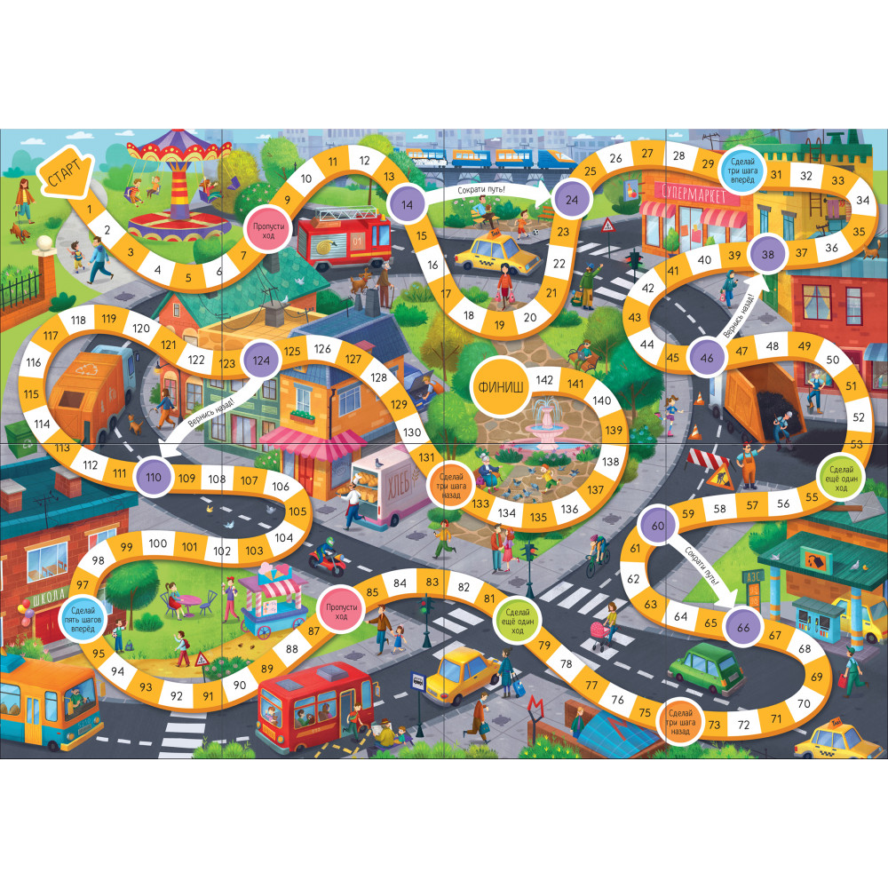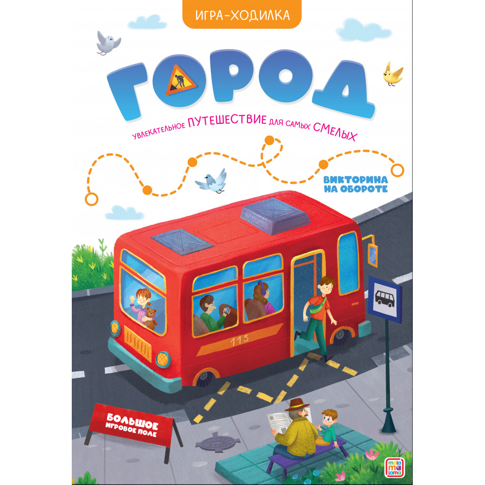 Игры-ходилки от торговой марки Malamalama — это весёлое и познавательное развлечение для малыша. Каждая книжка разворачивается в большой плакат, на одной стороне которого вы найдёте увлекательную настольную игру, а на другой — викторину с удивительными фактами. Вместе с игрой-ходилкой «Город» ребёнок отправится на весёлую прогулку по уютному городку. Продвигаясь вперёд по красочному игровому полю, малыш погрузится в живую атмосферу улиц и площадей. А на обороте будут ждать 36 интересных вопросов о городах и обо всём, что в них можно встретить. С этими вопросами ребёнок сможет проверить свои знания и расширить кругозор. Фишки и кубик включены в комплект — игра полностью готова к тому, чтобы подарить малышу множество весёлых моментов.