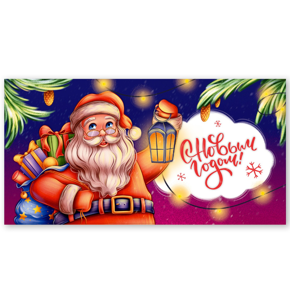 Конверт для денег «Новый год. Вид 3» предназначен для поздравления с Новым годом. Конверт выполнен из мелованного картона с золотым тиснением и выборочным УФ-лакированием. Формат 85×162 мм.