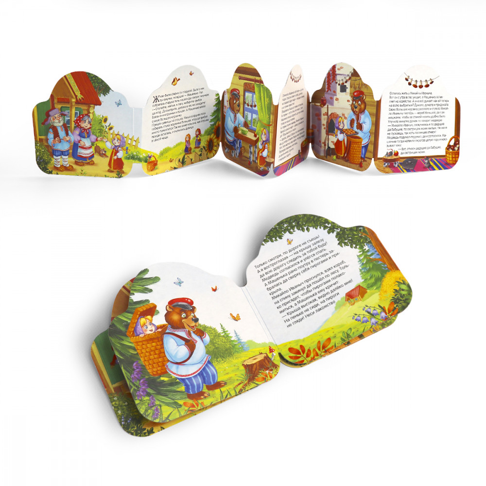 Серия двусторонних книжек-гармошек «Однажды в сказке» от торговой марки Malamalama — это любимые истории в удобном формате. Книжка-гармошка «Маша и медведь» познакомит вашего малыша с одной из самых известных русских народных сказок про находчивую Машеньку и простодушного медведя. Книга сделана из плотного картона и очень удобна для детских пальчиков. На каждой страничке — красочные иллюстрации, погружающие в сказочный сюжет. Благодаря миниатюрному формату книгу легко хранить и брать с собой в дорогу или на прогулку.