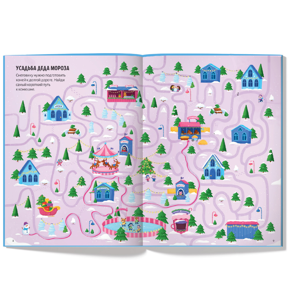 Книжка с лабиринтами «Новогодний переполох» — это неповторимая праздничная атмосфера радости и волшебства, а ещё любимые персонажи — Дед Мороз, Снегур...