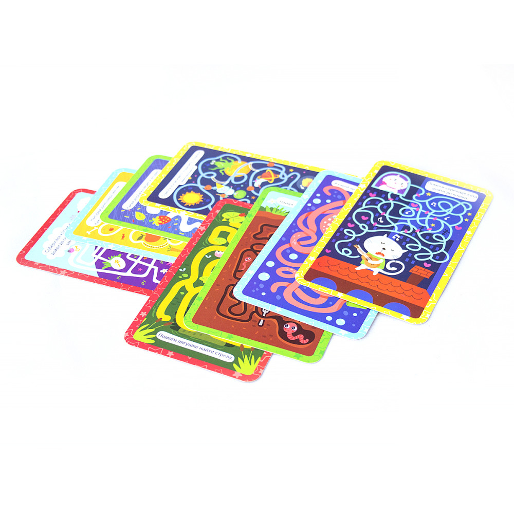 "Весёлые лабиринты" это набор ярких карточек, в которых малыш должен помочь героям распутать все лабиринты. Помочь коту покорить сердце возлюбленной, накормить динозавра и другие интересные задания ждут ребят в наборе умных карточек. Материал картон.